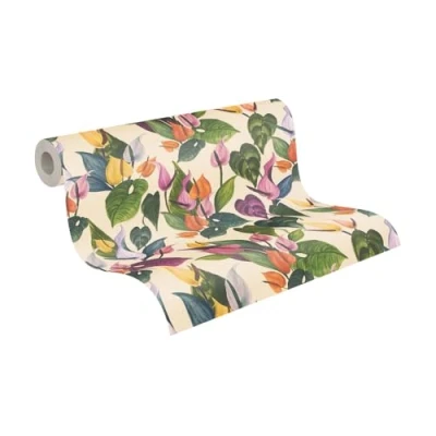 Livingwalls Anna D'Andrea Non Woven Wallpaper Floral 10,05 m x 0,53 Cream, Green, Pink, Multicoloured Leaves 782101