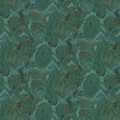 WallpaperDirectA lightly textured design with a bold Jungle leave pattern and a faux silk effect background. Shown in the Teal green with gold look highlights.