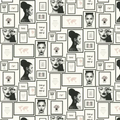 A gallery wall style design with black framed images on a white background with pink details. Can be hung as free pattern match.Search: model text