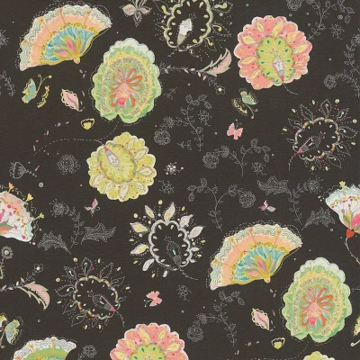Introduce artistic charm and expressive colour into your interior with this beautifully illustrated floral wallpaper, designed to stand out as a true decorative statement. Set against a deep black background, the design features an eclectic arrangement of ornate floral medallions, delicate foliage and whimsical botanical sketches, all brought to life in soft pastel tones of pink, yellow, green and coral. The contrast between the dark base and the intricate, hand-drawn motifs creates striking depth while allowing each element to shine with clarity and detail. The flowers are styled in a playful, almost illustrative manner, combining layered shapes, fine line work and subtle texture to give the wallpaper a crafted, artistic feel. Scattered botanical accents and dotted details add movement and visual rhythm across the surface, ensuring the design feels dynamic without appearing cluttered. A lightly textured finish enhances the richness of the colours and gives the wallpaper a fabric-like
