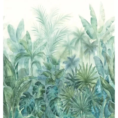 Serene jungle leaves in a wash of blue and green, much like a watercolour painting. Supplied as 5 drops on a 53cm wide roll. Mural can be repeated side-to-side if desired.