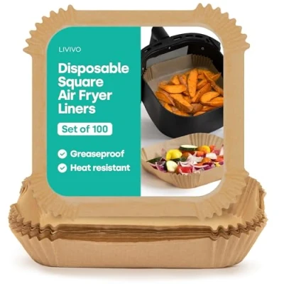 Livivo Disposable Square Air Fryer Liners Disposable, Greaseproof, Heat Resistant to 220C, Food Grade LFGB Standard, Compatible with Ninja, Tower, COSORI Pack of 100