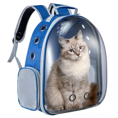 LN COZY CORNER Transparent Bubble Cat Backpack Space Capsule Pet Carrier with Hard‑Shell Dome, Breathable Mesh & Padded Straps Hands‑Free Travel Bag (Blue)