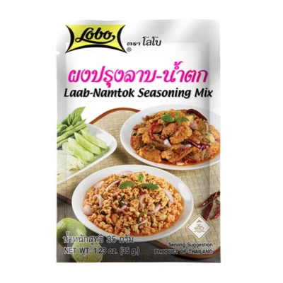 Lobo Seasoning Mix Laab-Namtok Bag 30g is a convenient blend of spices and seasonings designed to easily create authentic Thai Laab and Namtok dishes, featuring flavors like roasted rice, chili, garlic, and fish sauce. Simply add to minced meat for a bold, aromatic Thai meal at home.