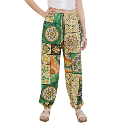 Lofbaz Women Boho Harem Pants High Waist Yoga Joggers Clothes Flowy Loose Summer Beach Trouser Hippie Bohemian Lounge Vintage Square Green OS