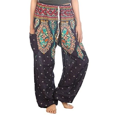 Lofbaz Women's Floral Printed Drawstring Boho Harem Pants Dark Blue S