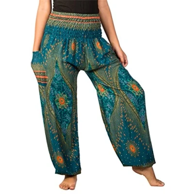 Lofbaz Women's Smocked Waist Diamond Yoga Harem Pants Teal Green L