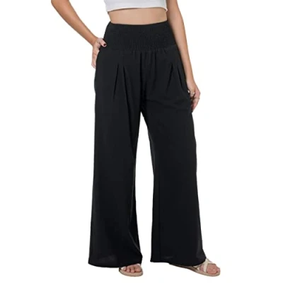 Lofbaz Women Summer Flowy Cotton Linen Palazzo Wide Leg Pants Beach High Waisted Trousers Boho Long Lounge Pant with Pockets Black M