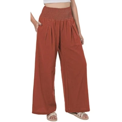Lofbaz Women Summer Flowy Cotton Linen Palazzo Wide Leg Pants Beach High Waisted Trousers Boho Long Lounge Pant with Pockets Rust S