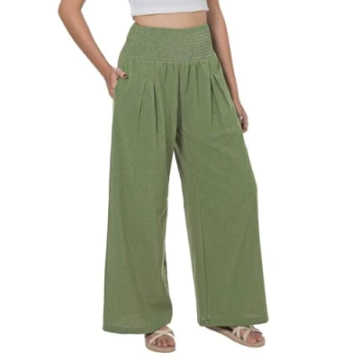 Comfortably Chic - These cute women's pants are designed for an effortlessly flattering fit. Crafted from soft, lightweight cotton and linen blend fabric to keep you comfortable all day long. Smocked waist closure provides a secure fit with a dressy look. Perfect Fit - Available in sizes S-2XL to fit most body types, petite or plus sizes. Features pleated front and loose, straight wide leg, creating a beautiful silhouette that complements your figure! Two side pockets adds convenience and style. On-Trend Style - Bring a touch of fun & femininity to your wardrobe! Wear them with your favorite tops for yoga or lounging in total comfort. Versatile Use - Exquisite casual pants suitable for any occasion: beach trips, hot summer travel vacation, maternity apparel, festivals, pajamas - it's perfect for any event that you're looking to feel laidback yet fashionable! Unique Gift Idea - An ideal hippie gift for your special someone! Handcrafted with care by artisans in Thailand. This flowy linen pant is sure to be treasured forever! Machine wash cold. Hang to dry. Do not bleach. Please refer to our size chart.