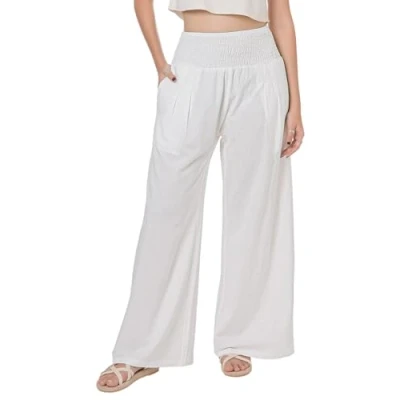 Lofbaz Women Summer Flowy Cotton Linen Palazzo Wide Leg Pants Beach High Waisted Trousers Boho Long Lounge Pant with Pockets White L