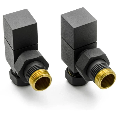 Part of the Loge range by Reina, this pair of Angled Radiator Valves showcase a modern and minimalist design with attractive square-shaped handles. Compatible with 15mm pipework, these 90 angled valves will connect your radiator to central heating pipework that comes straight through your floor.Although manufactured from durable brass, this pair of valves are finished with a bold and stylish anthracite grey finish that will blend seamlessly with your anthracite grey Reina radiator.Features & Benefits: Reina Loge Angled Radiator Valves Pair - Anthracite, Striking anthracite grey finish adds a bold, attractive look, Decorative square-shaped handles, A 90 angled brass radiator valve with 15mm inlet and outlet openings, Quick and easy to install, Designed for central heating hot water pipes from the floor, 1-year warrranty. Reina Loge Angled Radiator Valves Pair - Anthracite Brass