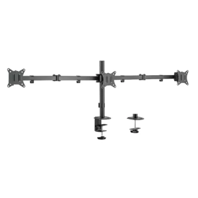 Fits 17-27" monitors - Monitor quantity: 3 Mounting type: table clamp or table hole mounting - load capacity: 7 kg max. per arm Maximum arm length: 658 mm - tilt: -45°/+45°, swivel: -90°/+90°, front plate rotatable: -180°/+180° Dimensions front panel WxH: 116x117 mm - VESA compatibility: 75x75, 100x100 Mast height: 407 mm, pole diameter: 35 mm - Cable management: elegantly hides all cables connected to the screen