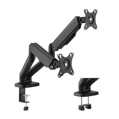 Fits 17-32" monitors - Monitor quantity: 2 Mounting type: table clamp (1-8 cm) or table hole mounting (1-4.5 cm) - load capacity: per arm 9 kg max. Maximum arm length: 450 mm each, tilt: -90°/+90°, swivel: -90°/+90°, front plate rotatable: -180°/+180° Dimensions front panel WxH: 115x115 mm - VESA compatibility: 75x75, 100x100 Dimensions: 937 x 105 x 570 mm. Colour: black