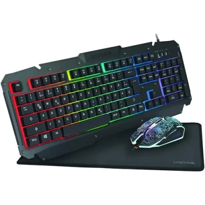 LogiLink ID0185 Gaming Set: Mouse (800 2400dpi Illuminated) & Keyboard with Stunning Metal Surface + Rainbow LED Backlight Mat (35 x 25 cm)