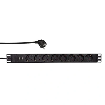 AmazonPower strip for mounting in 19 inch profile frame (1U) Robust aluminium housing, IP20 8 x earthing contact, 45° offset + 2 x USB 2.1 A each Connection with earthing contact plug (CEE7/7), angled Technical Data: 250VAC, 50/60 Hz, max. 16 A / 3500 W