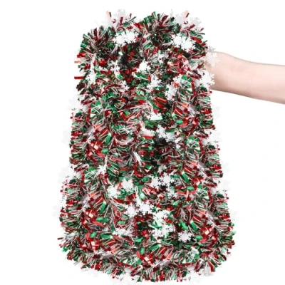 Christmas Garland: Beautiful Christmas tinsel garland comes with red, green, and white snowflake ornaments, each approximately 3.5 inches wide and 32.8 feet long The Christmas wreath is made of metal wire, which is thick, soft, and has a luxurious luster. Suitable for decorating your home, office and classroom, or wrapping around staircase handrails Christmas Party Decorations: Whether you're having a holiday office gathering, a fun classroom celebration, or a particularly heartwarming family gathering in a winter wonderland, decorate any place with our gold foil flower garlands to add a touch of brightness! DIY Your Christmas: These tinsel graland contains a soft metal wire that allows you to bend it into the shape you want. Fold this set up and completely wrap it around the Christmas tree Great for Christmas Decorations: The metallic chunky tinsel garland is suitable for Christmas tree wrapping, door frames, stair handrails, or displaying on fireplaces