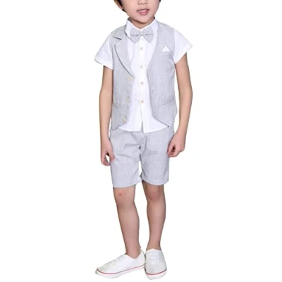LOLANTA 4PCS Page Boy Suits Wedding, Kids Summer Short Suit Set, Ceremony Christening Partywear, Waistcoat Shorts Shirt with Bowtie, 5 6 Years, Grey, Tag 120