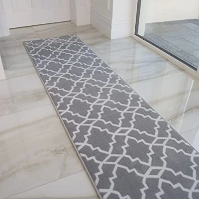Long Grey Geometric Trellis Runner Rug Silver Hallway Rugs Bedroom Living Room Kitchen Carpet Stair Mats 60cm x 230cm