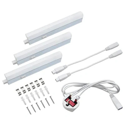 LED replacement kit for CFL T5 under cabinet lights in slim line profile 6000k cool white, high brightness consuming only 9w in power 3 x end to end linkeable light fittings with UK plug socket Supplied as a complete kit which includes leads, screws and fixing plates On/Off switch on each luminare, Non dimmable