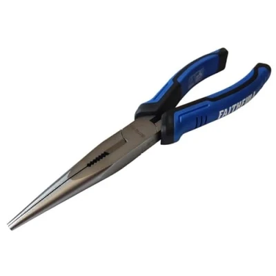 General description Faithfull Long Nose Pliers are designed for precise gripping and maneuvering of small objects in tight spaces. They feature long, serrated jaws for maximum grip and are tapered to a fine point for detailed work. Made from durable chrome vanadium steel, these pliers offer strength and corrosion resistance, making them ideal for various applications. Technical specifications Length: 200mm (8in) Cutting Capacity: 1.6mm Handle Type: Cushion grip Material: Chrome vanadium steel with satin nickel finish Compatibility and accessories Suitable for electrical work Jewelry making General small object handling No additional accessories required Installation No installation required; ready to use out of the box. Usage Use the pliers to grip, bend, or cut small objects Ensure a firm grip for precise control Handle with care to maintain the tool’s condition Other information Tested and certified to the GS standard ROHS compliant