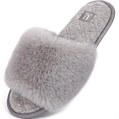 Fuzzy & Luxury Women's Slipper Shoes - Soft furry vegan friendly faux fur upper plus terry cloth lining, with fashion glitter trim perfect for girls or ladies who love fancy and warm feet. Breathable design wicks away moisture quickly after a long day walking or a hot shower. Features quilted details can best pair with your pajama Cushioning & Support Open Toe Cosy Women's Slippers - High density 80D memory foam cushions your every step for ultimate supportive comfort and feels like ergonomic pillows under your feet. Multi-layer sponge and EVA insole absorb shock to lessen muscle fatigue and make you truly relaxed when slip on these fluffy open toe scuffs Non Slip Rubber Sole - Durable & lightweight outsole provides non skid traction and indoor & outdoor versatility. So you can wear them freely at home in living room or bedroom. You can also step outside the house to fetch the morning paper in garden or check the mailbox without switching shoes Perfect Gift Choices - Available in 9 colors, light gray, cute pink, sexy black, creamy beige, navy blue, wine red, bright orange and luxurious purple. These fuzzy house shoes are perfect for women of all ages and lifestyles. They are great gifts for girlfriend, wife, mommy, daughter or your loved ones who would like to refresh her daily family look. Also perfect for bride, lady, travel and holiday wear Sizing & Caring Tip - These casual fluffy slide slippers come in 4 sizes (size 3-4, 5-6, 7-8, 9-10) could fit all standard, slim or wide feet. If you are between sizes (such as size 4.5, 6.5, 8.5, etc.), please get the next size up. These bedroom slippers are also machine washable, which makes caring for them easily
