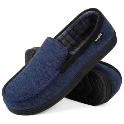 LongBay Men's Moccasin Slippers Memory Foam Plush Fleece House Shoes in Indoor Outdoor Fashion Navy, 9