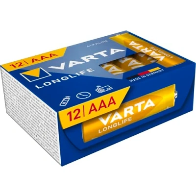 Powerful and leak-proof alkaline battery Premium quality batteries, delivering perfect energy for continuous loads in low voltage devices. 10 years power in storage, VARTA Consumer Batteries GmbH is certified to international standards: DIN EN ISO 9001 and DIN EN ISO 14001 Ideal for devices with constant and low energy needs, such as toys, remote controls, wall clocks or radios. Scope of supply: VARTA Longlife Micro (AAA) Alkaline Battery, 12 pieces