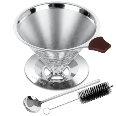Double Mesh Design: The coffee filter is made of 304 food-grade stainless steel without using paper filters. The bottom is integrated with the filter element, solid and not break. The dual coffee dripper brewing design prevents any coffee grounds from passing, no grounds end up in your cup. Humanized Design: The bottom leakage hole is the right size to ensure the full residence time of the coffee and the silicone hand-held handle is high-temperature resistant and anti-scald. Free cleaning brush and coffee scoop offered. Easy to use: Simply heat the coffee filter with hot water and rinse, add coffee grounds, slowly pour hot water, drain the water from the coffee maker through the fine filter, and remove the coffee dripper and you are done, ready to enjoy your beverage. Perfect fit: The stainless steel coffee hand filter has a wide, secure base that fits most cups, mugs, and thermoses. Pour or brew 1 to 4 cups of coffee at a time. Easy to clean: Our stainless steel coffee filter can be quickly rinsed. Clean the filter thoroughly every 3-4 weeks, descaling can be done with vinegar (lemon juice) and warm water., Manufacturer: LOOFORE