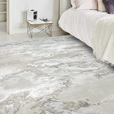 ManoManoGeneral description The Aurora rug features a stunning marble design in grey and beige tones, creating a luxurious focal point for your living room and bedroom. Its lustrous pile adds a touch of elegance to any interior. Technical specifications Dimensions: 120 x 170 cm (4' x 5'6') Material: 65% polyester, 35% polypropylene Design: Shiny, metallic abstract Usage Easy to clean: Vacuum with no attachment, just suction Shake thoroughly outside for maintenance