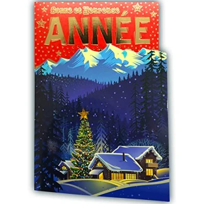 LOT10 61 4071 A BA Set of 10 Cards + Envelopes Golden Happy New Year Mountain Cut Out Star Collage