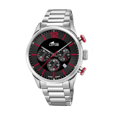 Men's analog chronograph watch. Round 316L stainless steel case in silver colour. Silver coloured 316l stainless steel strap with double push-button closure. Round black dial with mineral glass. Water resistance: 10 ATM.