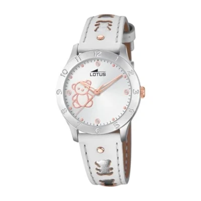 CASE DIAMETER: 35MM CASE MATERIAL: STAINLESS STEEL SILVER STRAP DETAILS: WHITE LEATHER WITH SILVER BEAR PATTERNS DIAL: SILVER WITH ROSE GOLD HANDS, PUNK MARKERS, CLEAR CRYSTALS AND A BEAR PATTERN WATER RESISTANCE: 5 BAR