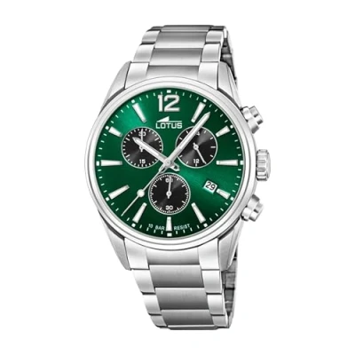 Very beautiful men's watch from Lotus from the Chrono collection The watch has a silver stainless steel case with a diameter of 42 mm Green dial, silver hands and indices, mineral glass, calendar, folding clasp, lotus logo The watch has a water resistance of 10 bar: your watch is suitable for snorkelling or swimming Equipped with a quartz movement