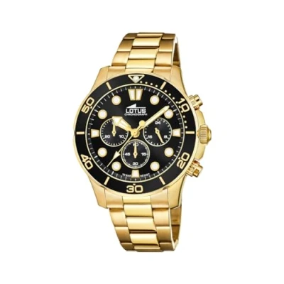 Men's analog chronograph watch. Round gold coloured 316l stainless steel case. Gold-plated 316l stainless steel band with deployant clasp. Round black dial with mineral glass. Water resistance: 10 ATM.