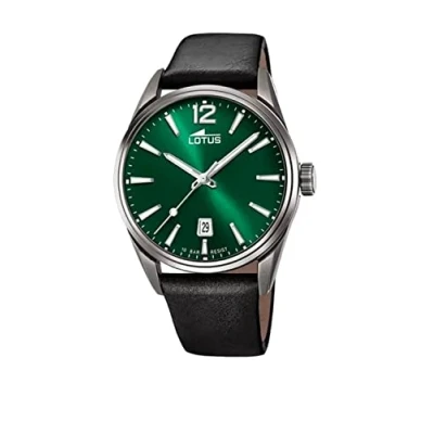 Very beautiful men's watch from the Lotus brand from the Chrono collection The watch has a grey stainless steel case with a diameter of 42 mm Green dial, silver hands and indices, mineral glass, calendar, pin buckle, lotus logo The watch has a water resistance of 10 bar: your watch is suitable for snorkelling or swimming Equipped with a quartz movement