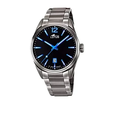 Very beautiful men's watch from the Lotus brand from the Chrono collection The watch has a grey stainless steel case with a diameter of 42 mm Black dial, blue hands and indices, mineral glass, calendar, folding clasp, Lotus logo The watch has a water resistance of 10 bar: your watch is suitable for snorkelling or swimming Equipped with a quartz movement