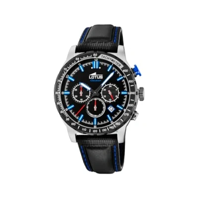 Black leather strap with pin buckle Silver stainless steel case with a diameter of 43.5 mm Black dial, stopwatch, blue hands and line index, date display, luminous hands, Lotus logo The watch has a water resistance of 5 bar (suitable for daily use, such as B. bathing, showering or washing The watch has a quartz movement