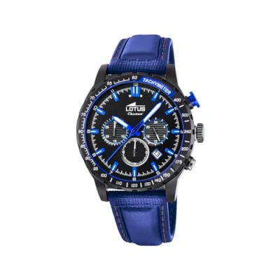 Blue leather strap with pin buckle Silver stainless steel case with a diameter of 43.5 mm Black dial, stopwatch, blue hands and line index, date display, luminous hands, Lotus logo The watch has a water resistance of 5 bar (suitable for everyday use such as B. bathing, showering or washing hands) The watch has a quartz movement