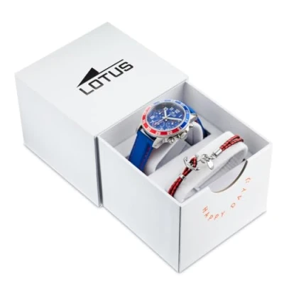 Analogue chronograph watch for children. 316L Stainless Steel Round Case, Silver Color Blue leather strap with pin buckle. Round blue dial made of mineral glass. Water resistance: 5 ATM.