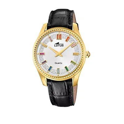 Very beautiful women's watch from the Lotus brand The watch has a gold stainless steel case with a diameter of 38 mm White dial, golden hands and colourful indices, mineral glass, pin buckle, lotus logo The watch has a water resistance of 5 bar (suitable for everyday use such as B. bathing, showering or washing hands) Equipped with a quartz movement