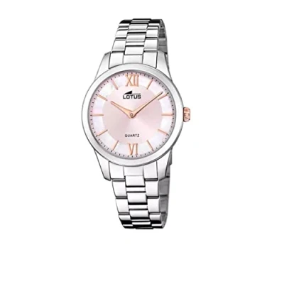 Very beautiful women's watch from the Lotus brand The watch has a silver stainless steel case with a diameter of 34 mm Pink white dial, rose gold hands and indices, mineral glass, folding clasp, lotus logo The watch has a water resistance of 5 bar (suitable for everyday use such as B. bathing, showering or washing hands) Equipped with a quartz movement
