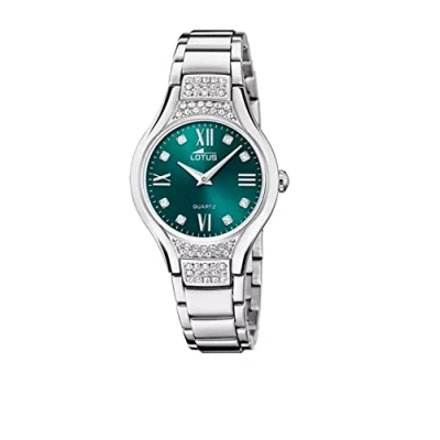 Very beautiful women's watch from the Lotus brand The watch has a silver stainless steel case with zirconia and a diameter of 32.5 mm Green dial, silver hands and indices, mineral glass, folding clasp, lotus logo The watch has a water resistance of 5 bar (suitable for everyday use such as B. bathing, showering or washing hands) Equipped with a quartz movement