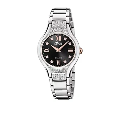 Very beautiful women's watch from the Lotus brand The watch has a silver stainless steel case with zirconia and a diameter of 32.5 mm Black dial, rose gold hands and indices, mineral glass, folding clasp, lotus logo The watch has a water resistance of 5 bar (suitable for everyday use such as B. bathing, showering or washing hands) Equipped with a quartz movement