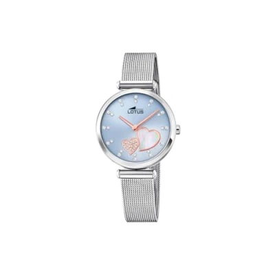 Case diameter: 29mm Case material: stainless steel silver Strap details: stainless steel Milanese silver Dial: blue with rose gold hands, clear crystals and two hearts Water Resistance: 5 bar