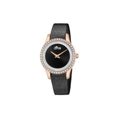 The stylish women's watch from Lotus is a real eye-catcher and can be worn with any outfit The high-quality black stainless steel bracelet with tilt closure fits comfortably on the wrist The black dial with the rose gold hands is protected by high-quality mineral glass The 7.9 mm thick rose gold stainless steel case has a diameter of 31.5 mm The watch has a water resistance of 5 bar (suitable for everyday use such as B. bathing, showering or washing hands)