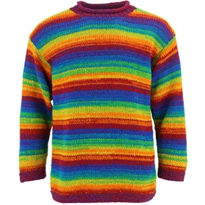 Chunky wool knit rainbow jumper featuring a rolled crew neck and double knit hem and cuffs. Warm wollen pullover, perfect for layering up on cold days or just for lounging around the house. This product is a handmade so minor imperfections and slight differences are common, this gives each product its unique character - which you can't get from mass-produced goods. Available in sizes Small, Medium, Large, X-Large and XX-Large - See below for a detailed Size Guide.