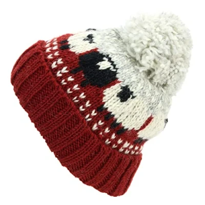 LOUDelephant Hand Knitted Wool Beanie Bobble Hat Sheep Maroon Grey
