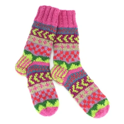 Handmade chunky wool knit slipper socks with a full fleece lining for warmth and a ruched design. These lovely socks are perfect for slouching around the house, they'll be sure to keep you warm and cosy. Available in lovely colours and designs, including striped and Space Dye. Made from 100% New Zealand sheep's wool and hand crafted in Nepal by artisans living and working in remote areas of the Kathmandu Valley, the wool is brought to the villages so that the knitters can maintain their close knit families and communities rather than going away to work in Kathmandu for large portions of the year. Available in One Size - Approx UK shoe sizes 4-8. Approx. Measurements: Heal to toe - 24cm / 9.4"; Heal to top - 23cm / 9.1".