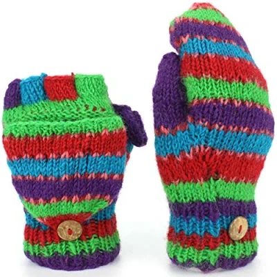 Wool knit fingerless gloves with a fold over mitten for the fingers and a separate thumb cover. Fleece lined for extra warmth. Available in One Size. Wool products will stretch and give with wear. This product is handmade, it is not mass produced so slight differences and minor imperfections are common.